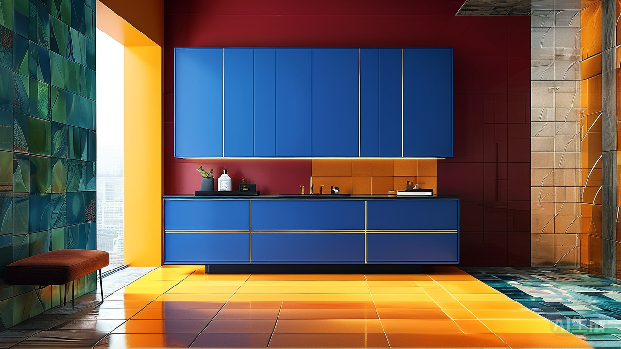 厨房里,克莱因蓝的橱柜如深海幽邃,地面却猛然跃入一片炽热的橘黄几何瓷砖——不是点缀,是爆炸性的视觉宣言。 冷与暖在此刻极致交锋,每一寸空间都如被电流激活,在烹饪的烟火气中迸发着未来感的光彩。而当浴室不再是苍白之地,墙面墨绿与勃艮第红的大胆拼接瞬间登场。它们如丝绒般浓郁深邃,金色几何线条勾勒其中,空间瞬间被笼罩在神秘戏剧场般的氛围里,日常沐浴化作华丽仪式。
