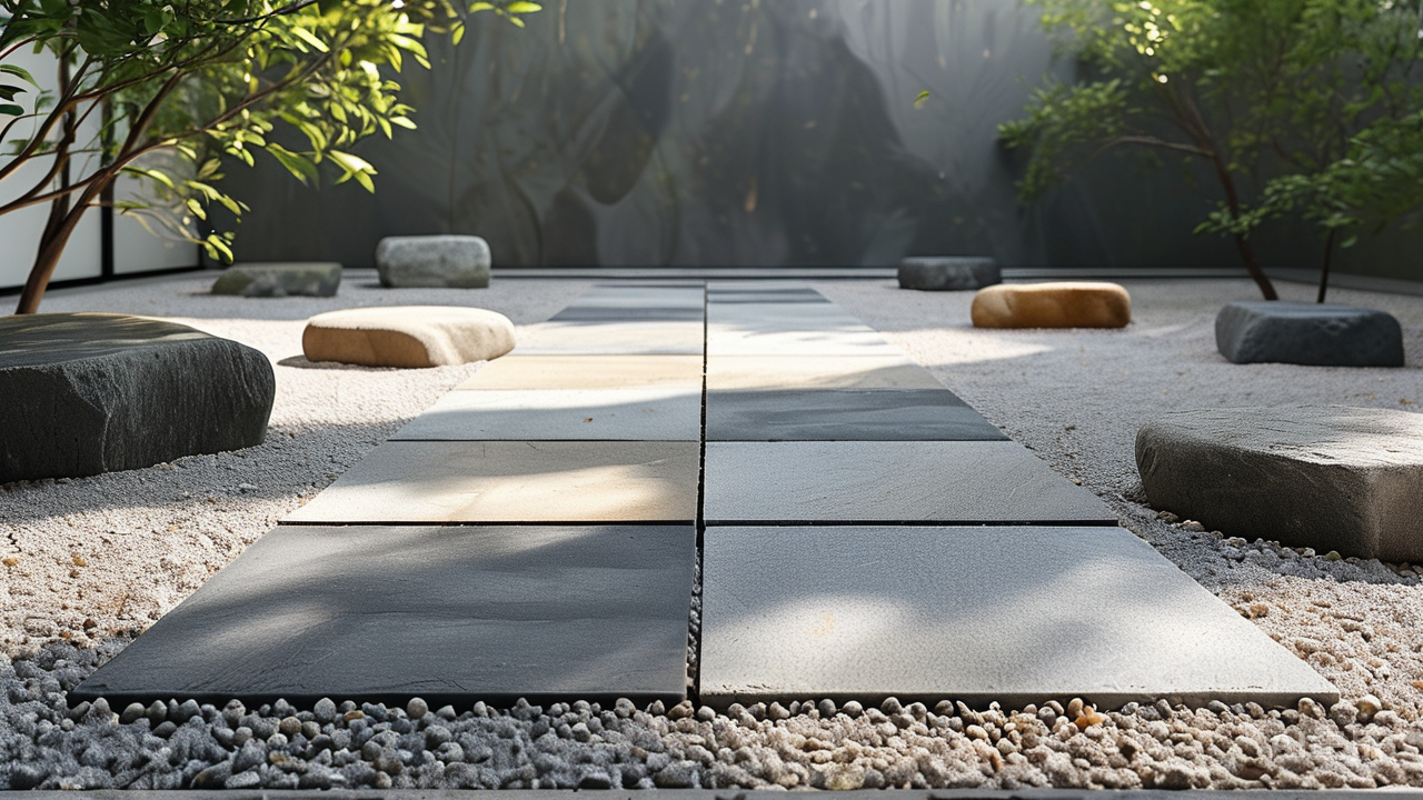 新中式庭院或入户区域,适合铺设哪些具有青石板或砾石效果的瓷砖?