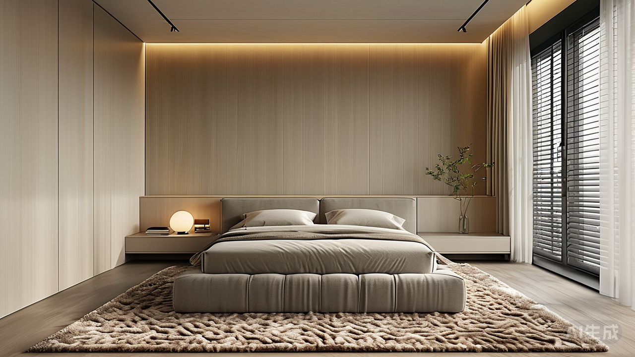 走向私密的卧室,地面的瓷砖延续了公共区域的语汇,但通过一块巨大的长绒地毯,瞬间提升了空间的柔软与温度。在这里,极简的原则体现得更为彻底——没有传统的床头柜,取而代之的是一块悬浮的层板;衣柜嵌入墙体,与墙面齐平,拒绝任何不必要的凸起。睡眠区域应有的安宁与庇护感,通过这种彻底的去装饰化得以实现。窗边一隅,放置着一把单椅和一盏落地灯,构成一个极佳的阅读角落,光线透过百叶帘,被切割成柔和的线条,洒落一身。