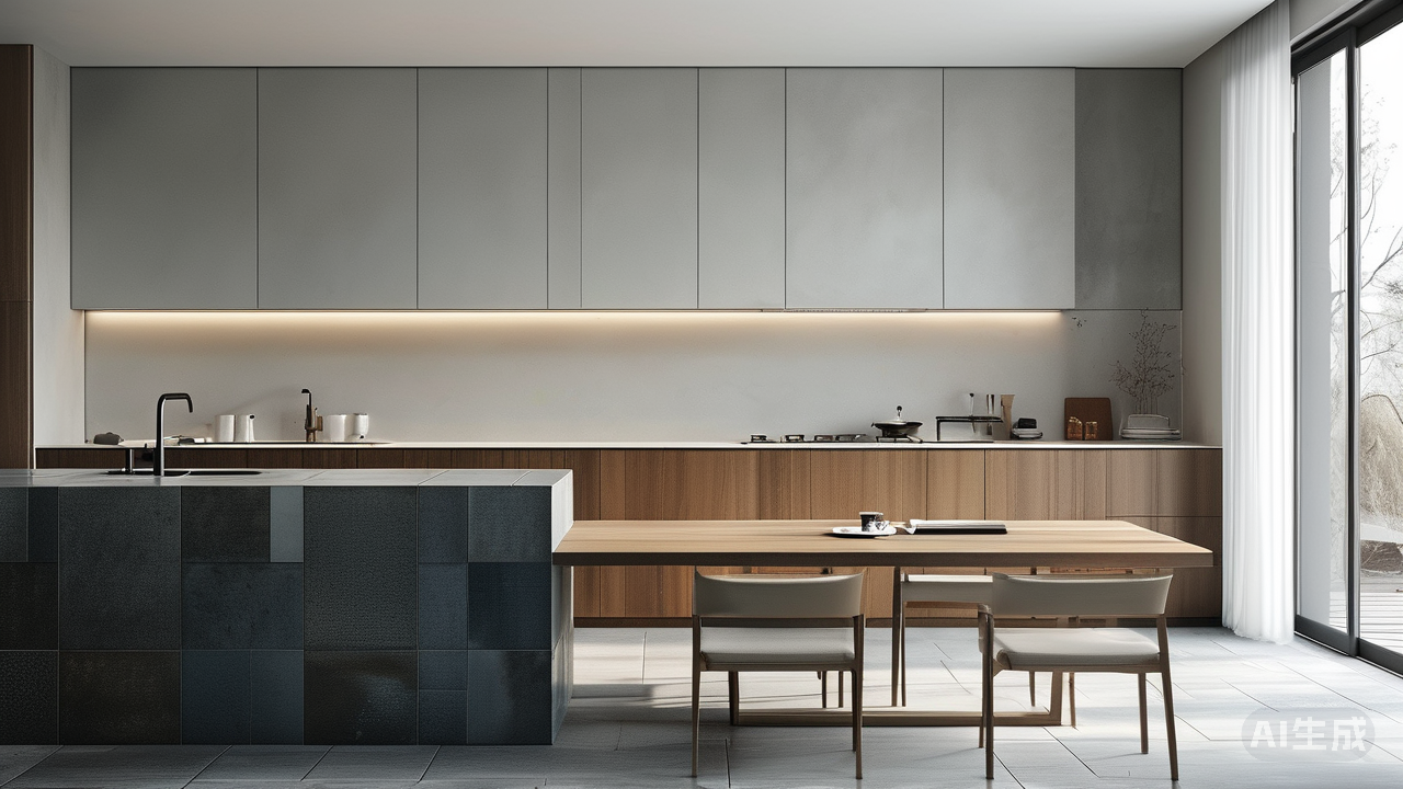 这种极简,并非空洞,而是一种积极的“留白”。它为生活腾出了呼吸的空间,也为居者的活动与思绪提供了舞台。在开放式餐厨区,岛台与餐桌一体成型,选用同一系列但纹理更深沉的瓷砖,功能与美学无缝衔接。午后,一杯手冲咖啡的热气,在冷调的石材台面上方袅袅升起,这种温暖的“人气”与材质的“冷感”恰好形成一种微妙的平衡,让空间不至于显得疏离,反而更凸显出日常的仪式感。